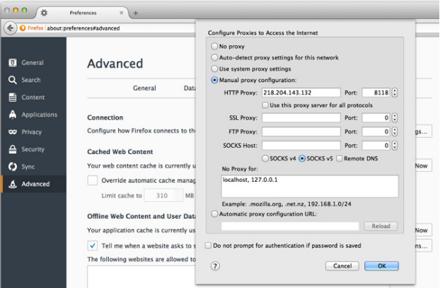Vào Preference => Advanced và chọn thẻ Network. Tại mục Connection, bạn click chọn Settings, sau đó chọn Manual Proxy Configurations.