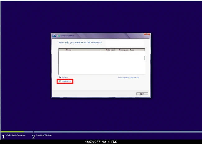 Bước 2: Dưới hình là hộp thoại trong quá trình cài Windows, với lỗi không thấy ổ ssd khi cài Win là bạn sẽ không thấy danh sách ổ cứng nào hiện lên. Click nút Load Driver ở dưới góc.