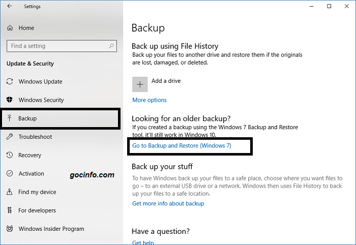 1.Trước tiên, đi đến Settings => Update & Security => mục Backup => click chọn Go to Backup and Restore (Windows 7). Có lẽ vì tính năng này được Microsoft mang từ Windows 7 lên nên thêm ghi chú ở sau.