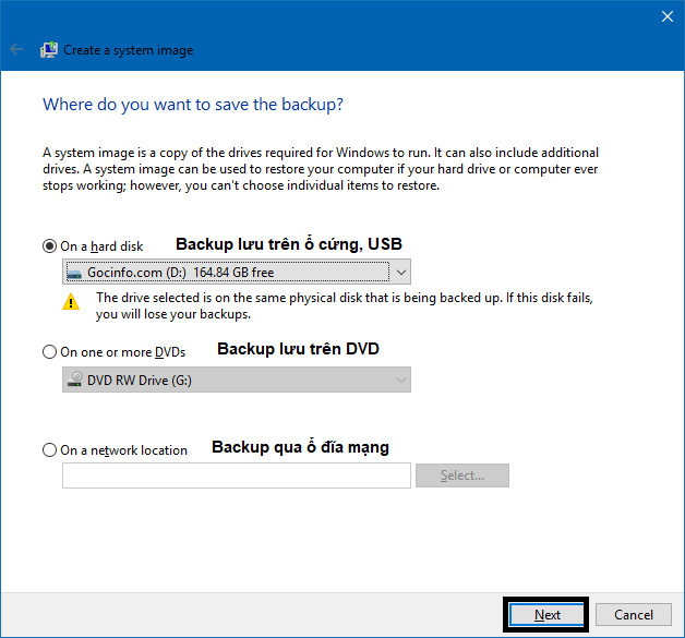Bạn cũng có thể dùng ổ cứng hiện tại và backup dữ liệu vào một phân vùng ổ đĩa khác ổ cài Windows. Nhưng điều này không được Windows khuyến khích và cũng không nên đâu. Vì chung một ổ cứng vật lý như vậy nếu ổ cứng có vấn đề thì file sao lưu hệ điều hành của bạn cũng sẽ bị ảnh hưởng.