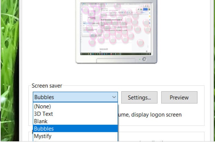 • Lựa chọn chế độ màn hình chờ bạn muốn ở mục Screen Saver. Hình minh họa sẽ xuất hiện trong biểu tượng màn hình máy tính