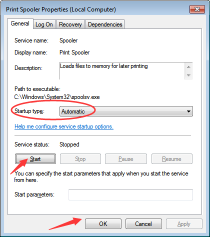 4. Nếu “Service status” đang tắt (Stopped), click nút Start. Lưu ý “Startup type” phải được thiết lập là Automatic. Sau đó nhấn OK để lưu lại thiết lập.