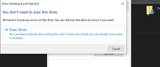 Tuy nhiên, nếu bạn muốn quét ổ bằng mọi giá, chỉ cần nhấp vào Scan drive trong hộp thoại. Thao tác này sẽ bắt đầu quá trình quét CHKDSK.